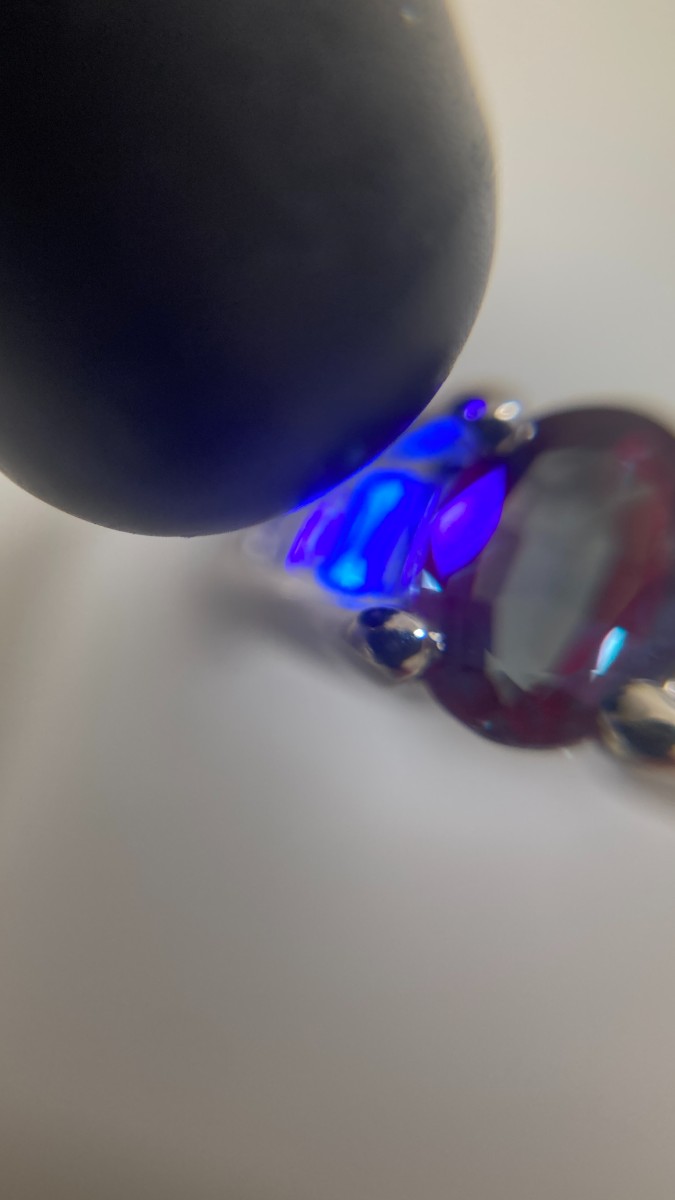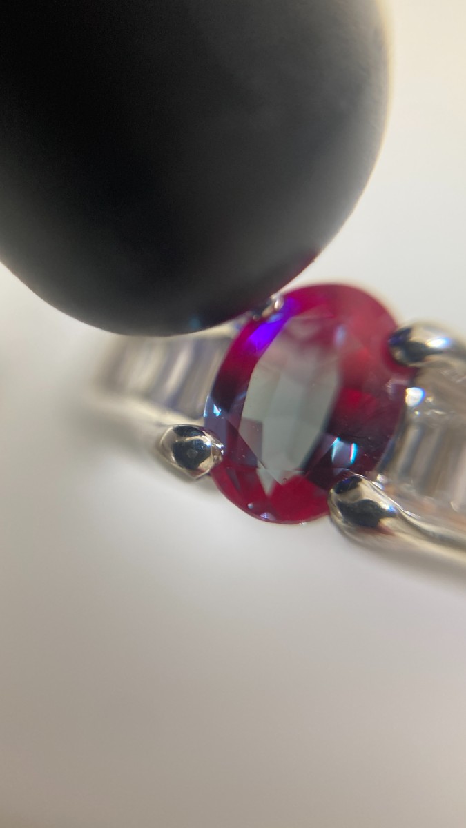 蛍光灯の下では緑色に、白熱灯の下では赤色に輝く変色効果が最大の特徴です👑